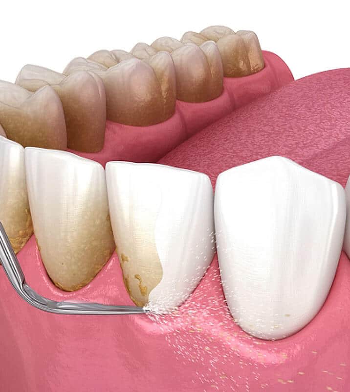 - Scaling: When scaling is performed, calculus and plaque that attaches to the tooth surfaces is removed. The process especially targets the area below the gum line, along the root. Scaling is performed with a special dental tool called an ultrasonic scaling tool. The scaling tool usually includes an irrigation process.